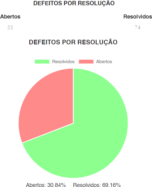 É fundamental saber o percentual de defeitos resolvidos para medir a “saúde” do projeto de teste. Neste caso, quanto maior a quantidade de erros corrigidos, maior é a probabilidade de o software estar com a qualidade adequada. É interessante visualizar também a quantidade de defeitos que estão em aberto, a fim de ter uma visão macro do projeto relativo ao que precisa ser solucionado.